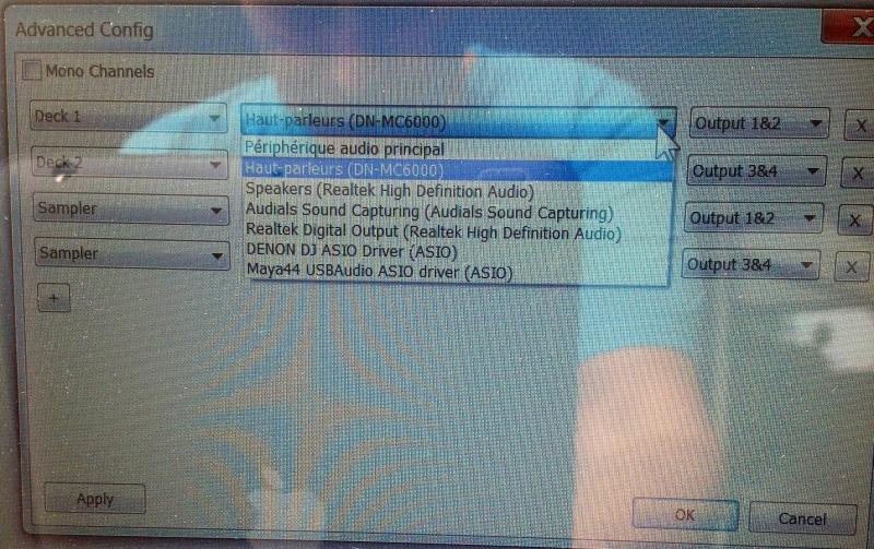 Dans ADVANCED CONFIG j'ai assignez les sorties 1 et 2 pour le deck 1 et 3 et 4 pour le deck 2 avec la carte son denon dn mc6000