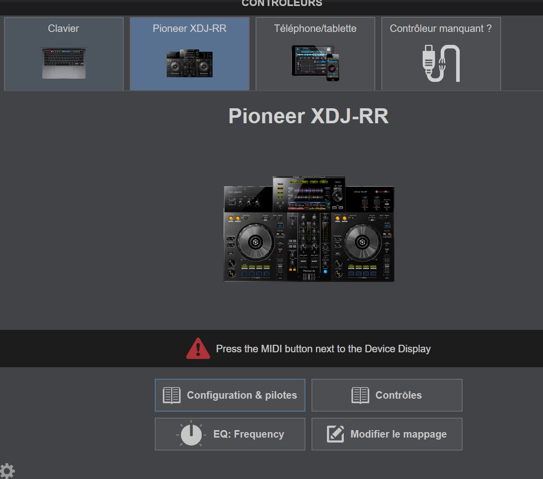 Dans les paramètres, j'ai bien le XDJ RR reconnu, par contre, sur cette page, j'ai toujours un bandeau noir avec un point d'exclamation "Press the midi button next to the device" en permanence, même après appui le bouton MIDI ce bandeau reste apparent sur cette page de config.