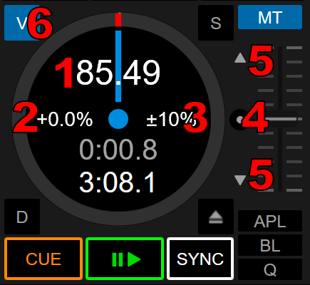 - Scan: Start an automatic BPM scan of the track (useful if you messed up and you want to reset the BPM analysis)