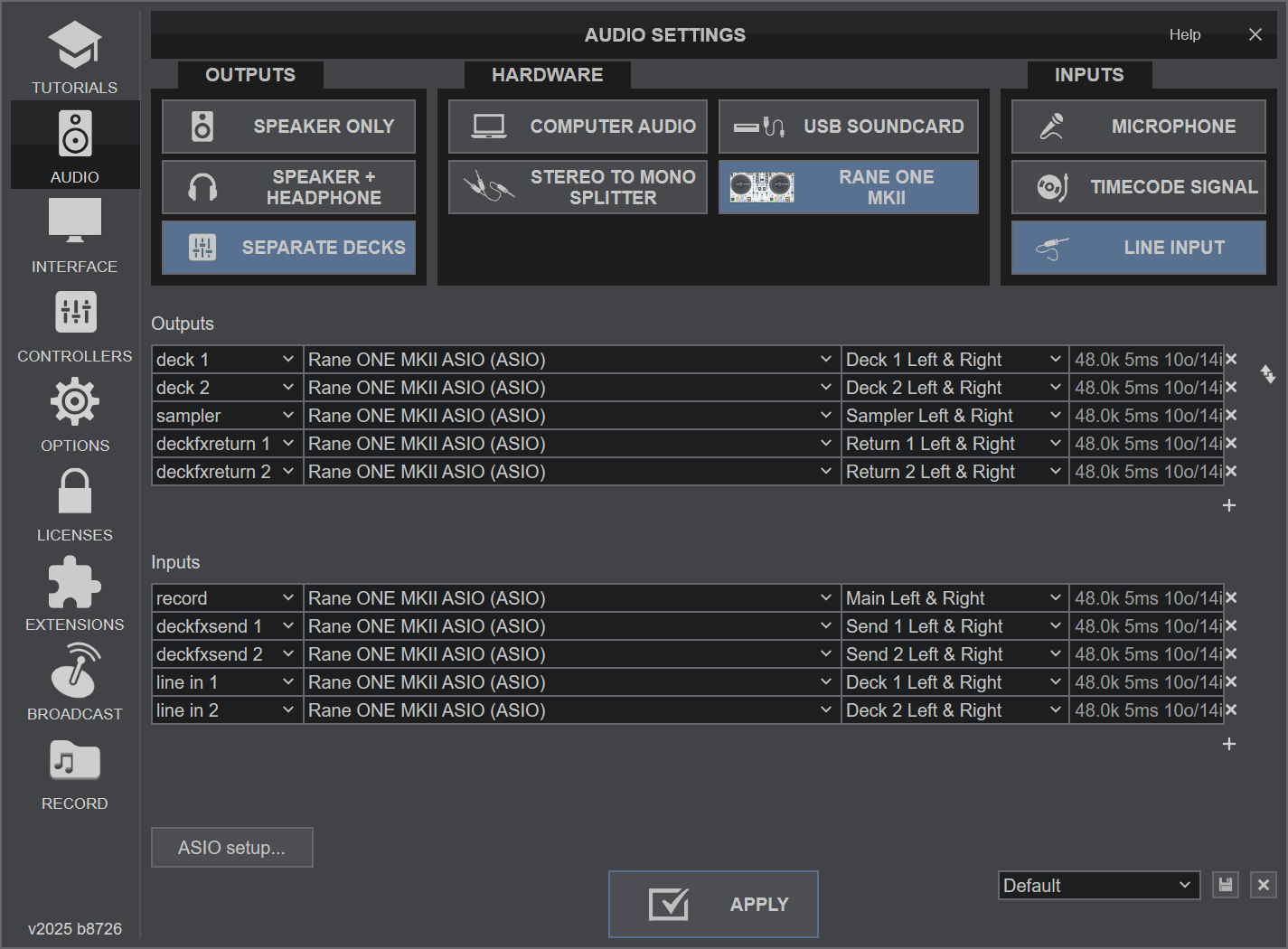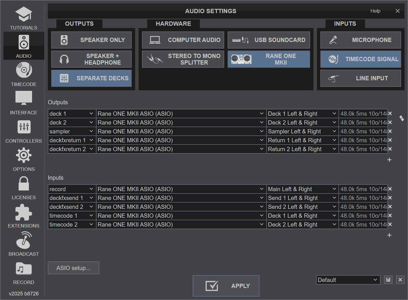 Rane One MKII Audio Configuration with Timecode Inputs Configured - Click on "Apply" button