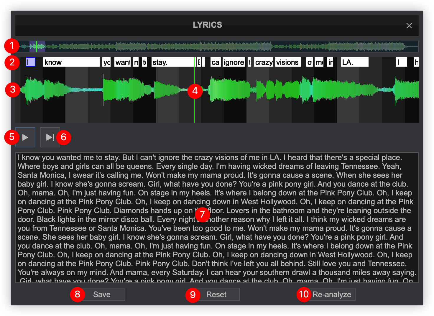 The Lyrics Editor provides the ability to edit auto generated lyrics for any track. Timing and text can both be adjusted inside of the editor in order to customize karaoke tracks, build your own, or simply have fun with word play.