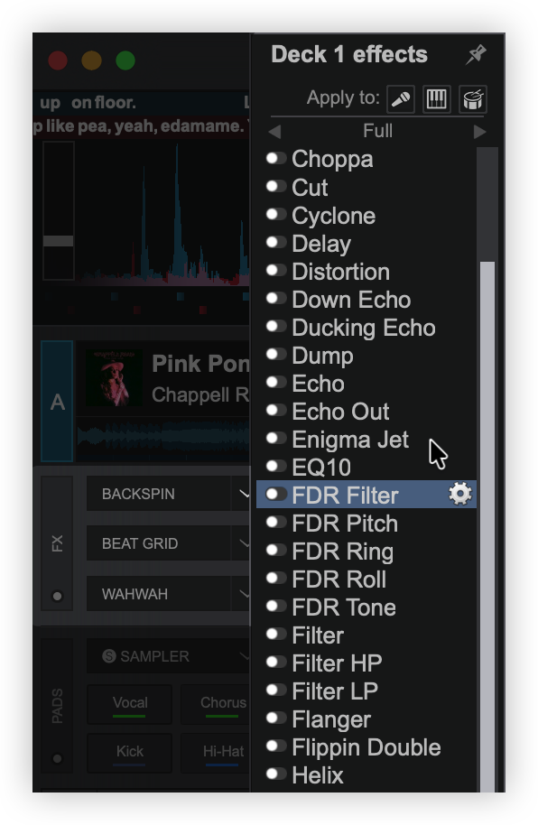 Once the Effect is selected it can be activated by clicking on the effect name in the Deck Effect Panel or in the Effect Selection List by clicking on the Activate Button to the left of the desired effect.