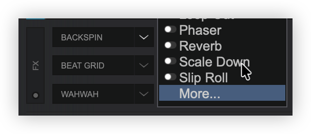 Clicking on the effect name will trigger the desired effect, while clicking the dropdown arrow will open the FX menu providing the ability to select one of the many other effects available.