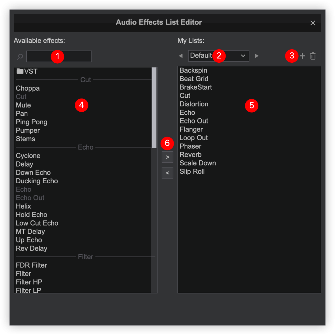 The Audio Effects List Editor will open to add and remove effects in the available lists, create new lists, and/or delete lists.