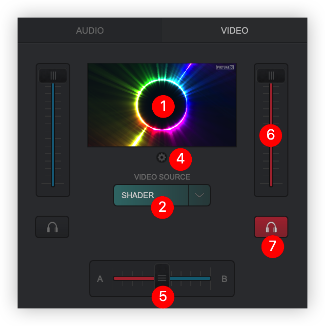 Cover VirtualDJ will display the album cover of the song playing Camera VirtualDJ will display a video feed from your computer's camera or external webcam Shader VirtualDJ will display animated visualizations (Shaders). A short list of Shaders are included, but more can be added. See here for more details. Slideshow VirtualDJ will display a slideshow of pictures from any folder you designate (Transitions) Switches Simple Video to Dual-Source Mixing mode and displays the Video Transitions menu in place of the Video Source menu. When in Dual-Source Mixing mode the Video Source menu becomes the Transitions menu and provides a wide range of various Transitions (to move seamlessly from deck to deck).