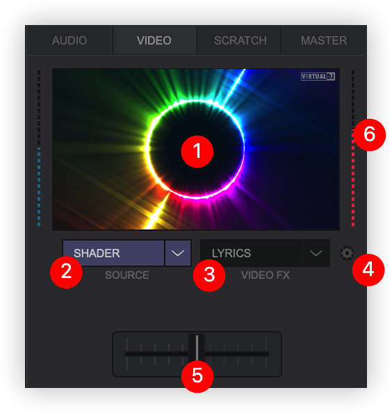 Video CrossfaderManual When checked will control the Video Crossfader independently of the Audio Crossfader. Linked to Audio When checked will control the Video Crossfader simultaneously with the Audio Crossfader. Smart When checked will move the Video Crossfader automatically to follow what the audience is hearing. - CROSSFADER. Used to mix the Video Output of the decks. If the Video Crossfader is at the far left or right side, only the Video from that deck will be displayed on the Master Video Output. At any other position, the Videos will be mixed depending on the selected Video Transition. Double Clicking the Crossfader will bring it back to the center position.