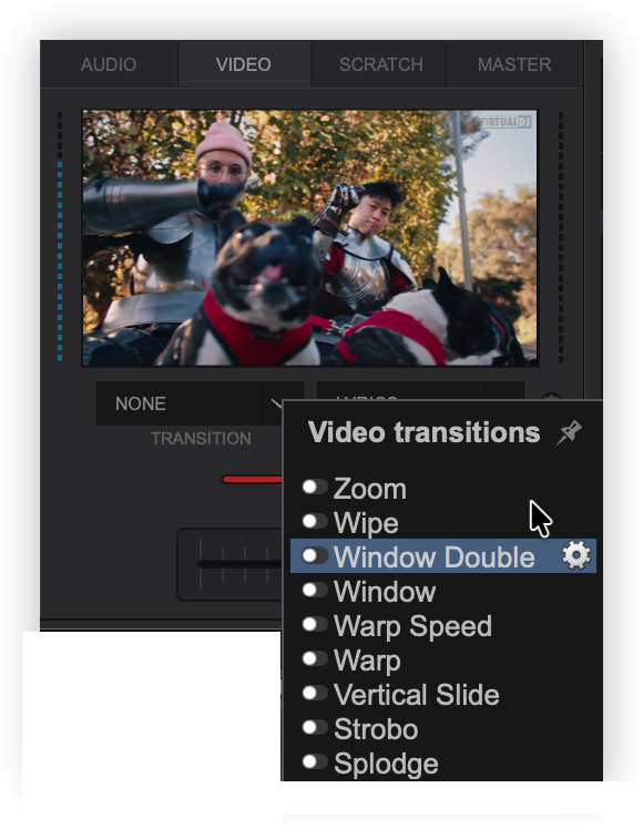 When a video gets loaded to a deck, the Video Mixer interface changes to a Dual-Source Mixing view which will change the Video Source menu to a Transitions menu.