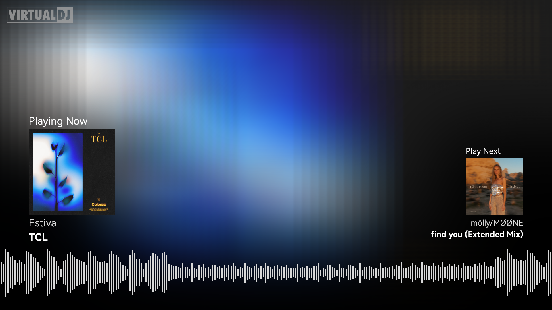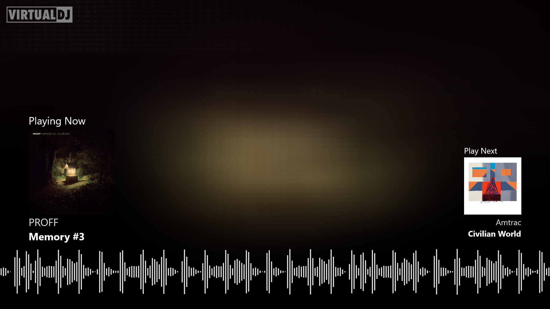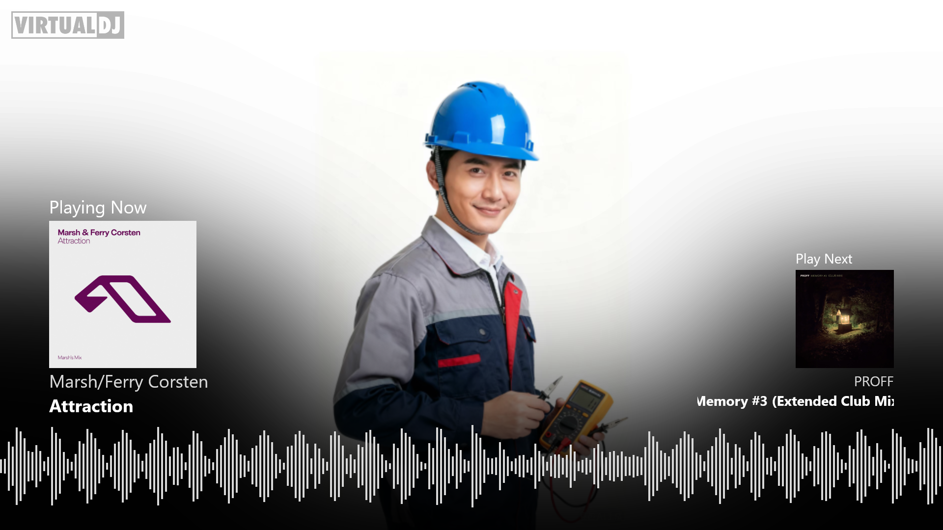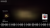 A clean white-and-gray broadcast video skin that shows the current track on the left and a preview of the next (browser‑selected) song on the right.