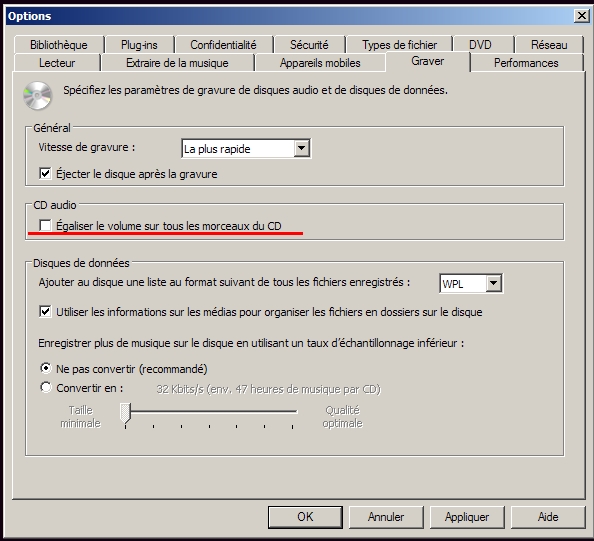 Pour la Gravure , sous Windows media player =>Graver=>Options =>