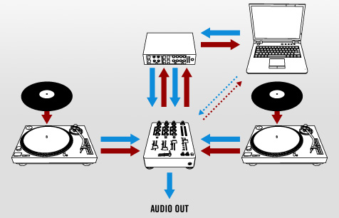 les Platines sur la carte son; la carte son à la table de mixage et en usb sur l\'ordi ; la table de mixage à l\'amplie.
