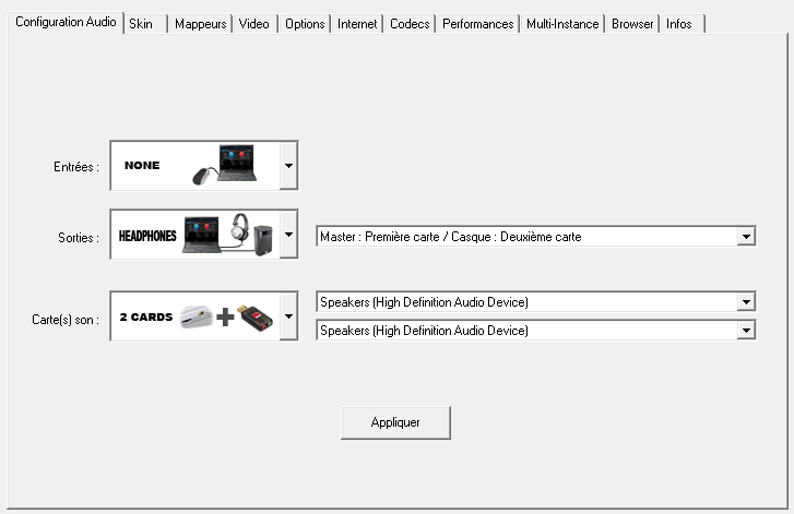 Dans ton cas, pour la deuxieme carte son, tu devras probablement choisir USB audio (ou encore le nom du péripherique audio représentant ton casque).