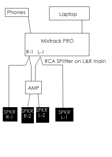Hte mixtrack pro is an odd beast. the 2 outputs don\'t work the way you think they should. re-read the owners manual -don\'t have mine in front of me - I believe one is only good for cueing so you can\'t use it if you have headphones plugged in. that is why you will need splitter cables if you are running 4 speakers. Ran mine that way for a while but eventually just pulled the plug on the 2nd set. what kind of set-up are you running? You have 2 powered speakers and and 2 passive speakers on an amp? Do your powered speakers not have pass through outputs? What is the physical arrangement? are they in separate rooms? What model speakers and amp are you using? In my experience with the Mixtrack pro RCA splitters from the main output are the way to go. You have to separate your RCA cables into single strands though to run the L/R to the proper sides and keep them color coded.