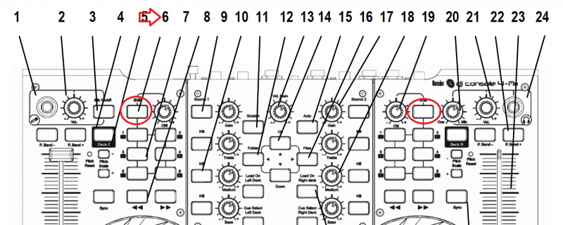 DJ Console 4-Mx fournit l’équivalent de 12 boutons par platine pour les effets, boucles et fonctions Cue, grâce au bouton Shift qui convertit les boutons 1 à 6 sur chaque platine en boutons 7 à 12. Les fonctions incluent : entrée et sortie de boucle, hot cue 1/2/3/4, enregistrement sampler, lecture sampler et 4 effets.