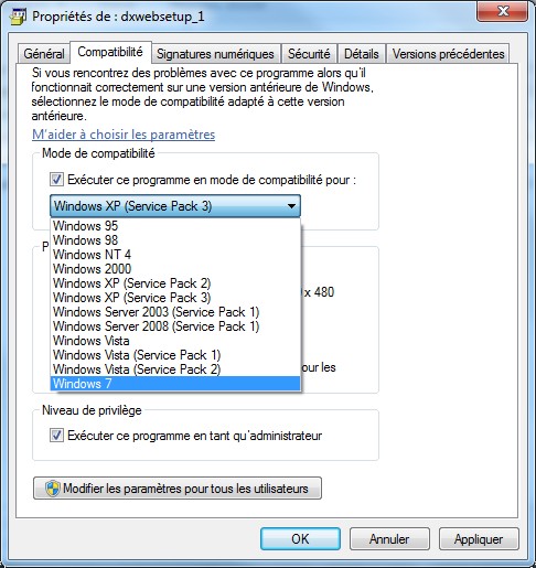 5) clic droit sur le programme -> propriétaire --> onglet compatibilité et coche Exécuter ce programme en mode compatible pour: [Windows 7] et cocher aussi [exécuter ce programme en tant qu'aministrateur]