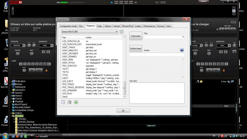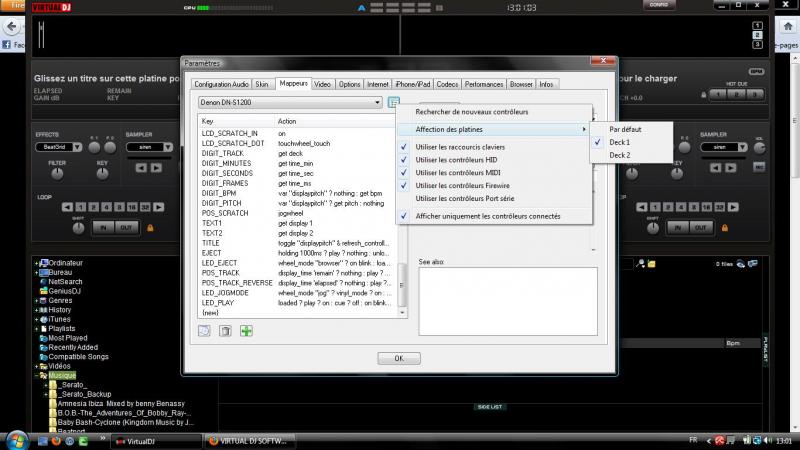 merci DJ rhum, mais je ne vois pas trop comment fire, dans l\'onglet mappeur il y a le menu deroulant, ou je peux choisir keyboard et denon dn-s1200,il n\'y a pas les 2 platines, donc je ne vois pas comment différencier les 2 decks...