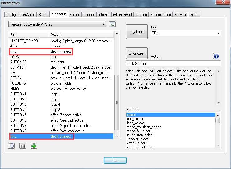 J'ai essayé de mettre Deck select dans la case action, enfin de faire ce que tu m'as conseillé. Probleme: il n'y a qu'une seul case PFL.