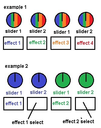 the idea is if you have 2 effects active you get the use of the first two sliders, if only one effect is active you get the use of 4 sliders... you coud probably do something with the leds for the effect activation buttons so if three effects are active the led could blink to let you know