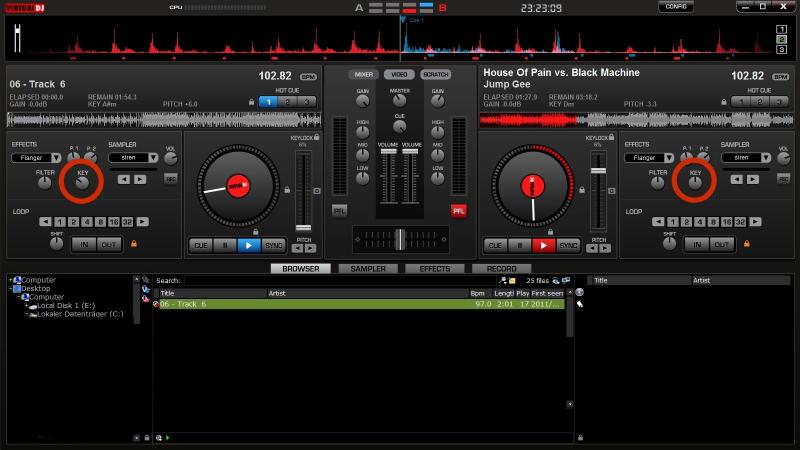 Desweiteren kann man am Anfang eines Mixes auch ein Jingel setzen,den man auf hoher Geschwindigkeit mit Keylock abspielt und dann in VDJ per klick auf der" 0" Pitchfader Stellung Automatisch runterfährt und mit dem nächsten Titel ineinandermixt.