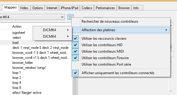 En effet la MK4 est une console à 2 voies, mais dans le mappeur il suffit de rajouter les 2 Decks supplémentaires relatives au skin 4 decks en mettant la syntaxe suivante : deck 1 vinyl_mode & deck 2 vinyl_mode & deck 3 vinyl_mode & deck 4 vinyl_mode et ensuite avec la souris d'activer la platine dans vdj en cliquant sur le cercle numéroté en haut à gauche de 1 à 4. puis d'appuyer sur le bouton Load A de la console qui chargera la chanson sur la platine activée dans vdj la 1 ou la 2. et sur le bouton Load B pour la 3 ou la 4.