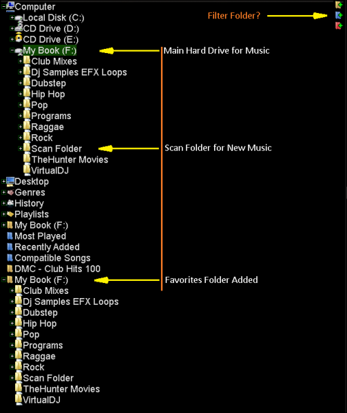 Gah, I had to reinstall VDJ7 after a reformat of my lappy, and re-encountering this same issue ... but for some reason the line code you gave me, I cant figure out how to get that working as you described here, and I could have sworn I was able to get it done last time :/. " -> isscanned = 0 and exists = 1" to filter folder right? Im getting this ...