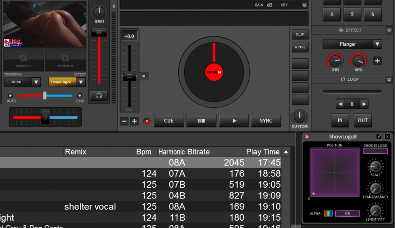 Not only is it very simple to remove the VDJ logo, but it is equally simple to add your own. There is a ShowLogo8 effect located in video effects, or available in the download section. Select the gear icon next to it, and it will open the(GUI), located to the right. There you can add your logo as a PNG, position it, scale it, and have it as transparent as you like.