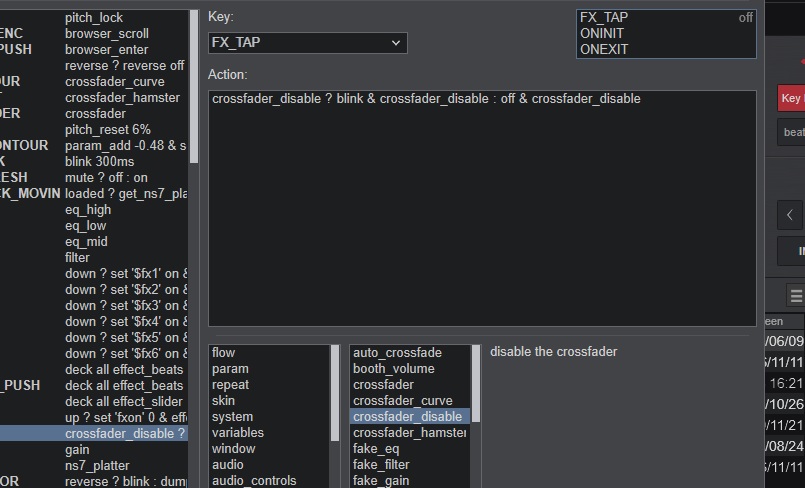 I would like to map the FX_TAP button to crossfader_disable & blink while active (active meaning the crossfader is disabled). When the crossfader isn't disabled (meaning crossfader is active again). I would like for it to end blinking. What would the script be?