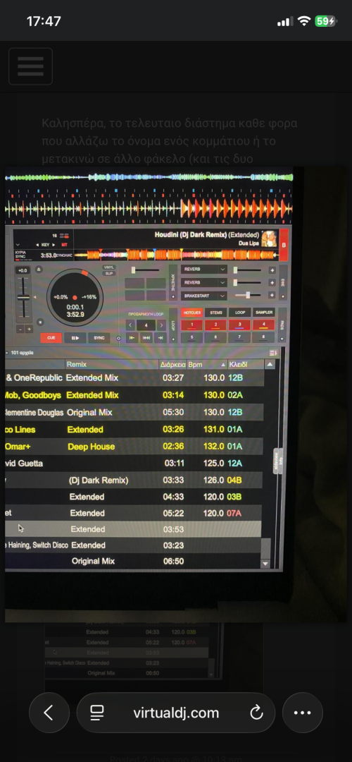 Καλησπέρα, το τελευταιο διάστημα καθε φορα που αλλάζω το όνομα ενός κομμάτιου ή το μετακινώ σε άλλο φάκελο (και τις δυο διαδικασίες τις κάνω μέσα απο το virtual, εργασίες αρχείων -> μετονομασία ή μετακίνηση σε αντίστοιχα ) τότε την επόμενη φορά που θα ξανά συνδέσω τον σκληρό δίσκο ( η μουσική μου και η διαδικασία αυτή είναι σε εξωτερικό ssd, τον Sandisk portable ) σε πολλούς φακέλους υπάρχουν αρκετά κομμάτια χωρίς bpm και έχουν το πράσινο σηματάκι αριστερά τους σαν να διαβάζει πρώτη φορά, αλλά υπάρχουν τα hot cues κανονικά και όταν πατάω επαναυπολογισμος bpm επιστρέφουν όλα, στους φακέλους που δημιουργείται αυτό το πρόβλημα δεν έχω μετακινήσει ή μετονομάσει κάποιο κομμάτι πριν. Ανεβάζω και φωτό πως φαίνεται.
