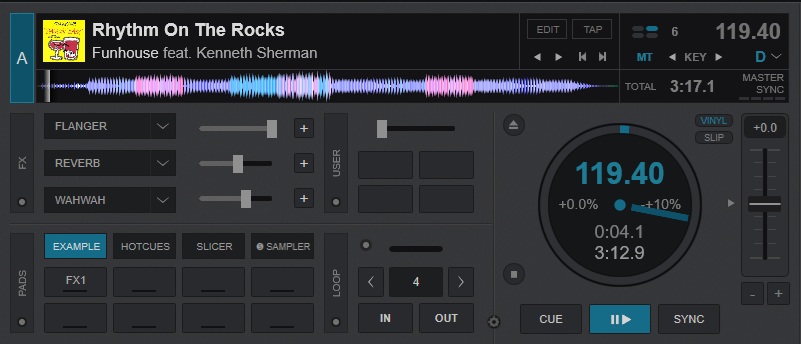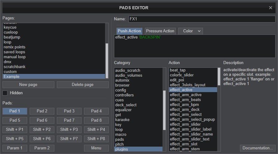 Figura 1 - Criei o pad e salvei uma NEW PAGE com o nome EXAMPLE, criei para o botão PAD1 acionar o efeito BACKSPIN ao pressionar, e dei o nome do botão como FX1