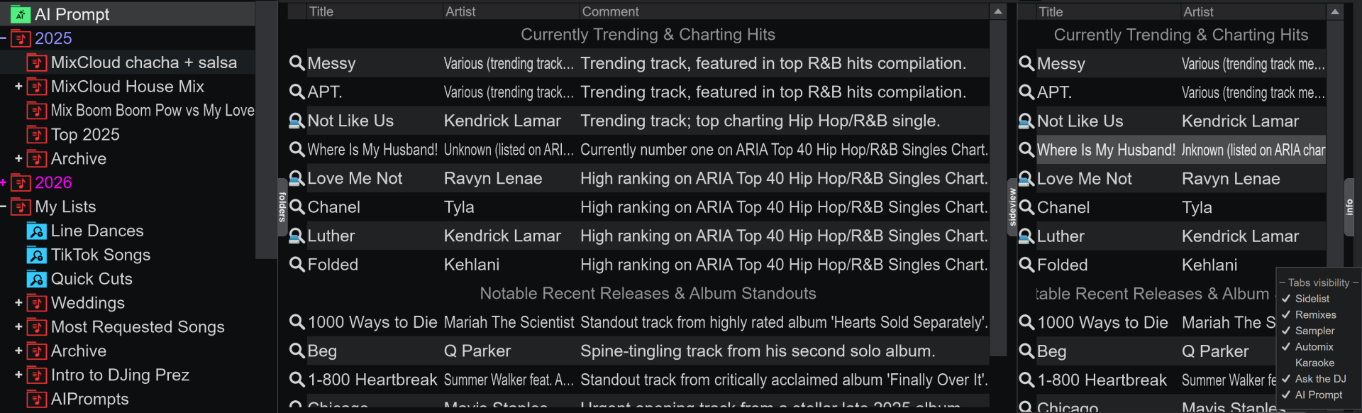 I have been playing with the new features in VDJ. There is an AIPROMPTS side folder (w/ sidelist, automix, etc). I have been able to drag search results from an AI prompt into the folder. I can also drag and drop the results into SIDELIST. So what is the difference of the two side folders? What is the real purpose of the AIPROMPTS folder?