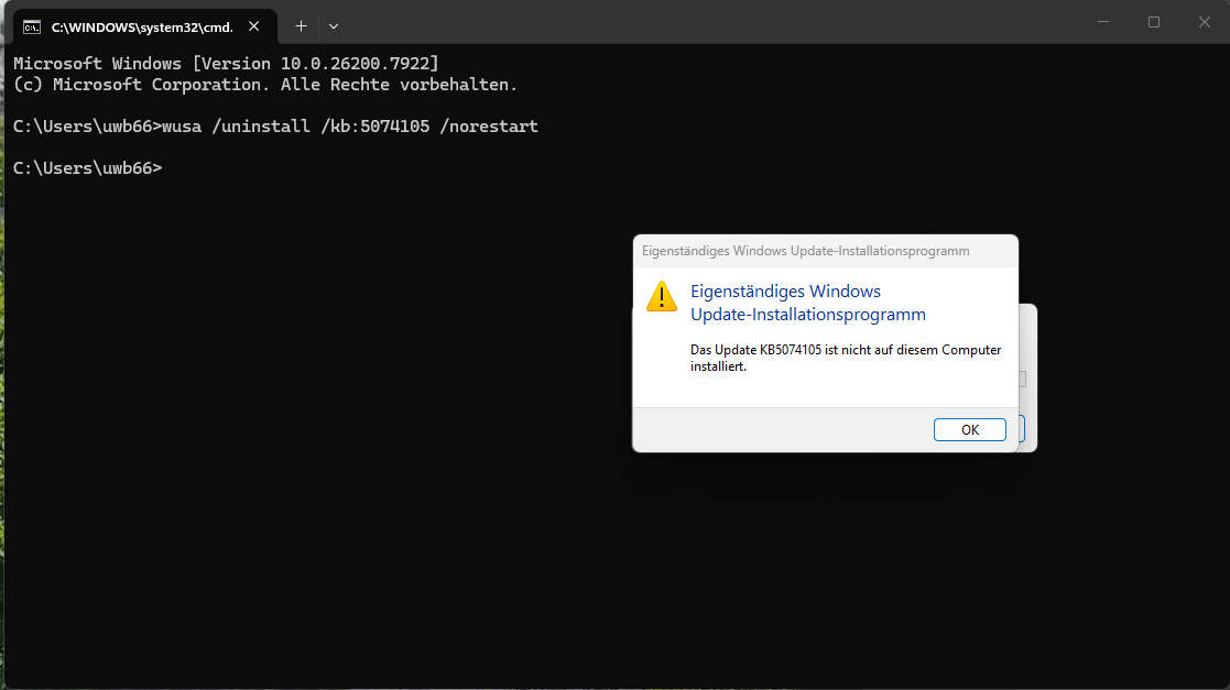 Check on the command prompt to see if the other two updates are uninstalled (KB5077181 and KB5077241).