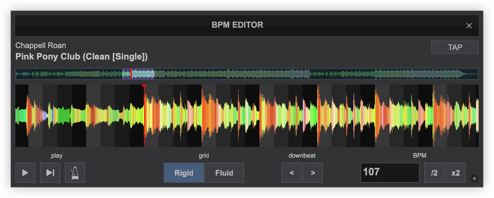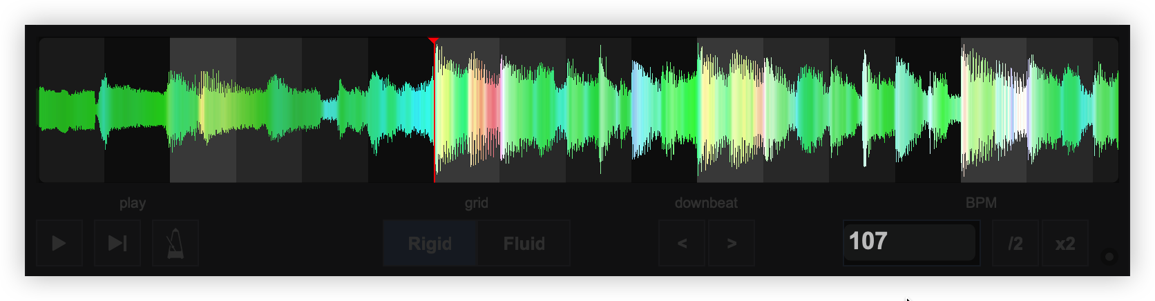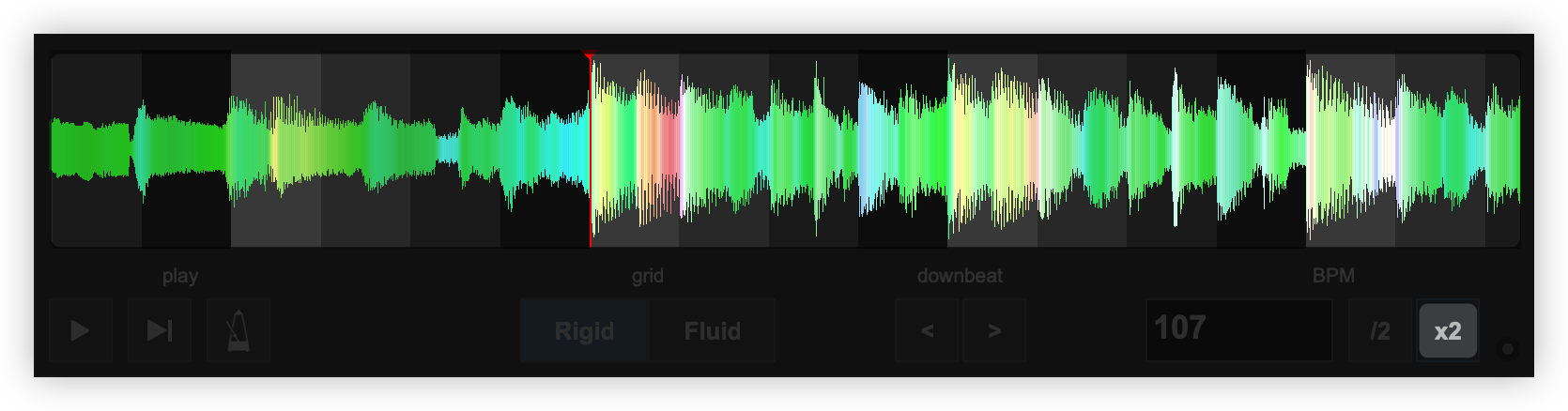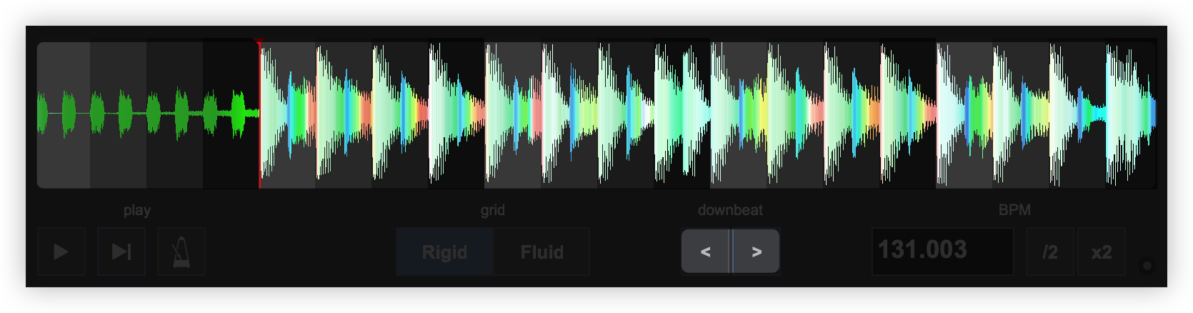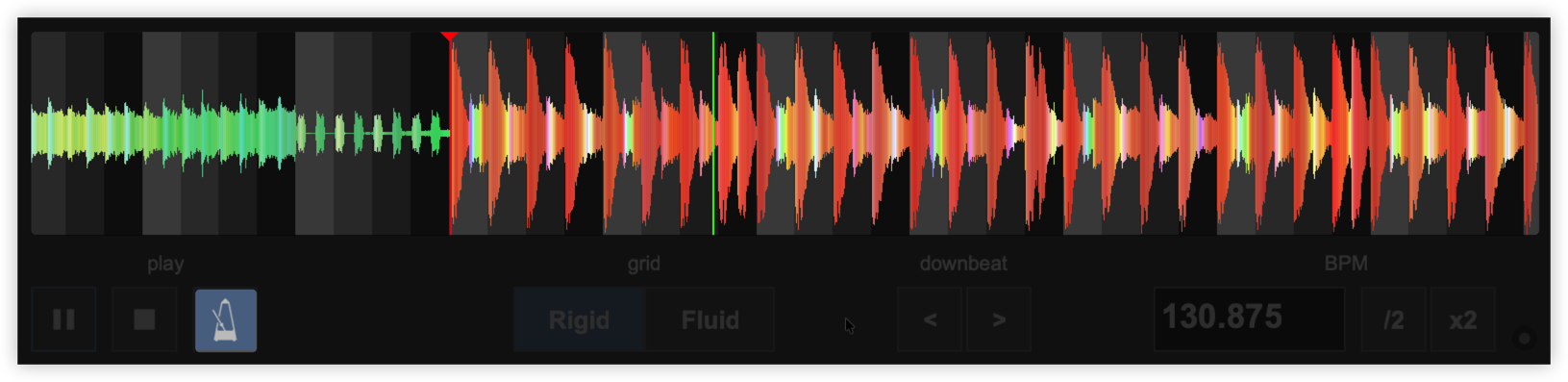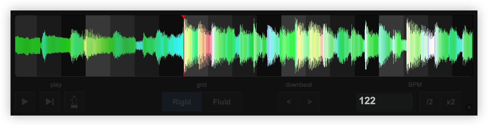 Once the BPM Editor is opened, the track will be analyzed and the multi-colored waveform will be displayed, providing information of its structure based on the detected frequencies. The grey-scaled background indicates the 4 beat pattern of the beatgrid of the track. The red vertical line indicates the Beatgrid anchor (first detected beat) if a Rigid BPM is detected (default). If a Fluid BPM is selected from the Grid Mode dropdown, multiple anchors will be displayed.