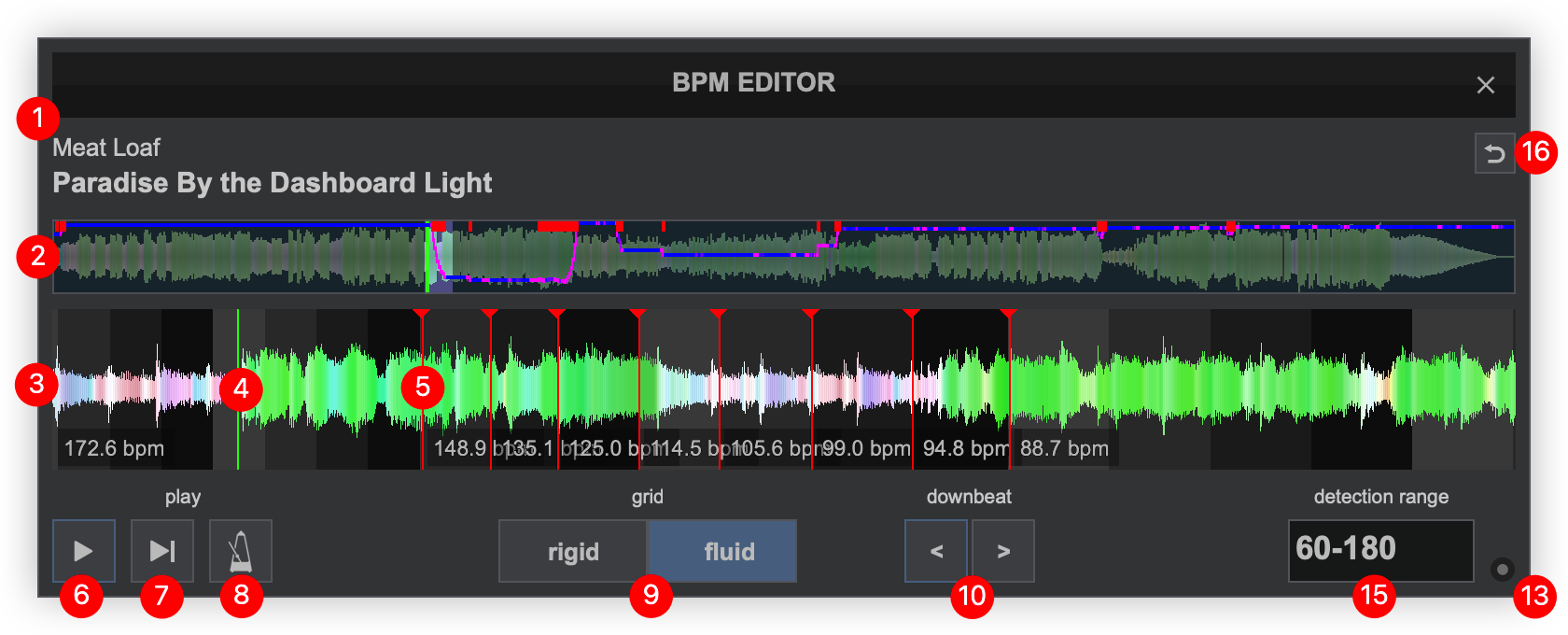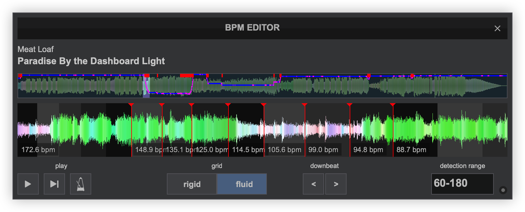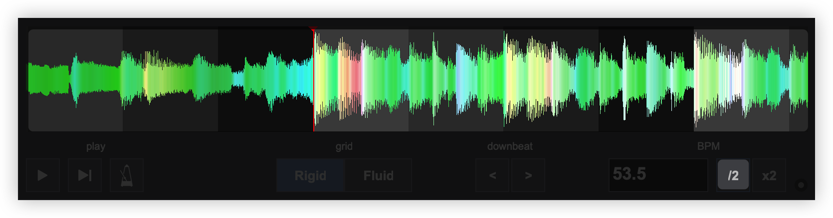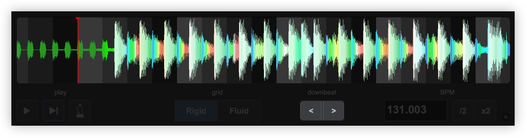 Rigid Displays the first detected beat as analyzed by VirtualDJ. It can be grabbed with the mouse to adjust it’s position. The Computer Beat Grid (CBG) is locked into place (non-adjustable) to the left of the anchor. Adjustments to the CBG can only happen to the right of an anchor. Fluid Displays multiple anchors with BPM values when the grid has fluctuating BPMs. Each anchor can be grabbed with a mouse to adjust it's position. - PLAY/STOP. Will play the track if it is stopped and will stop the track if it’s playing.