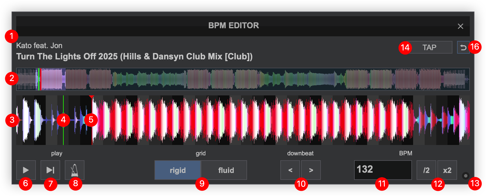 - WAVEFORM. Provides a visual display of the audio information. It displays the beatgrid using the grayscaled background and can be zoomed in to make precise BPM adjustments with a wheel mouse.
