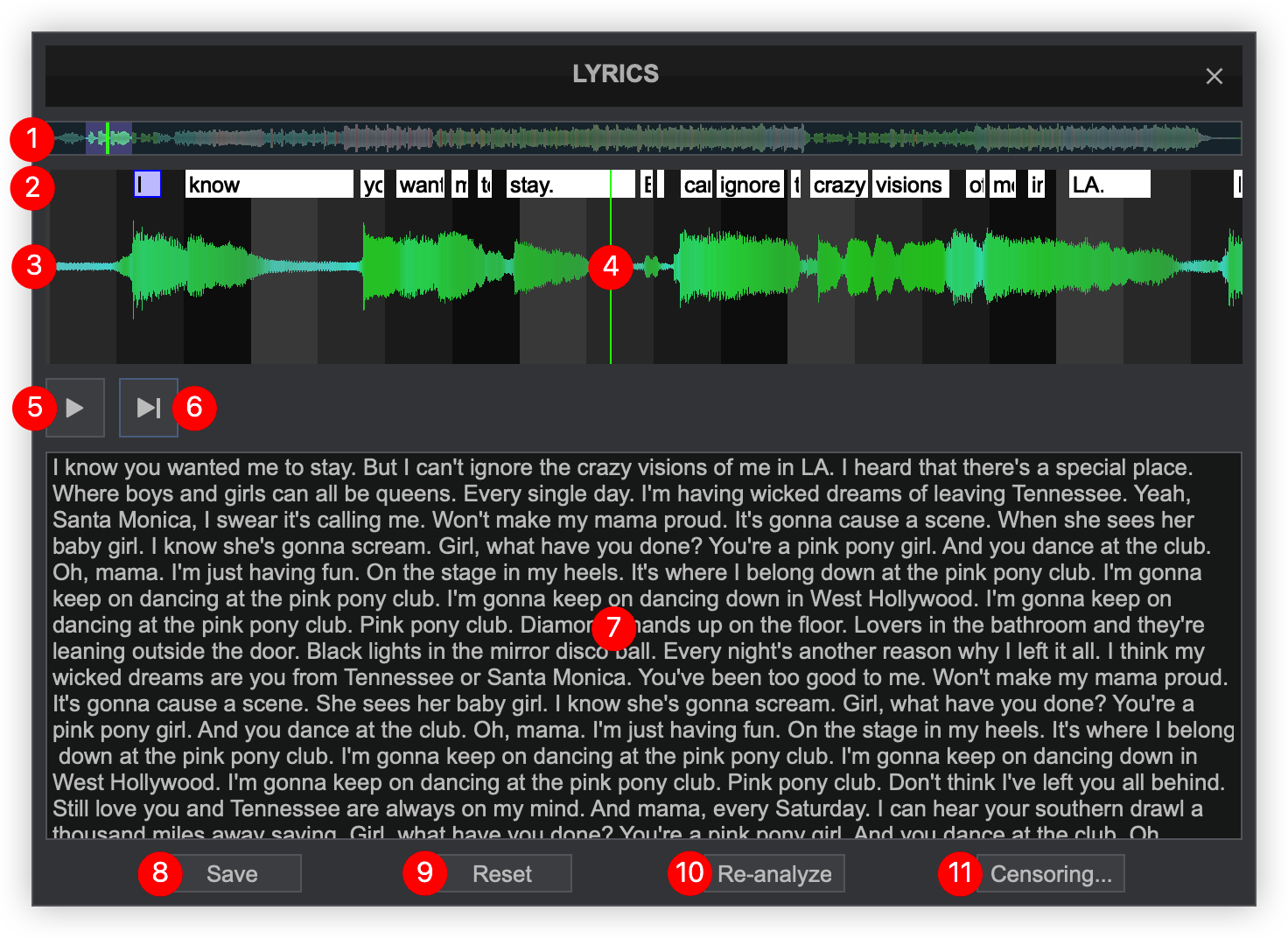The Lyrics Editor provides the ability to edit auto generated lyrics for any track. Timing and text can both be adjusted inside of the editor in order to customize karaoke tracks, build your own, or simply have fun with word play.