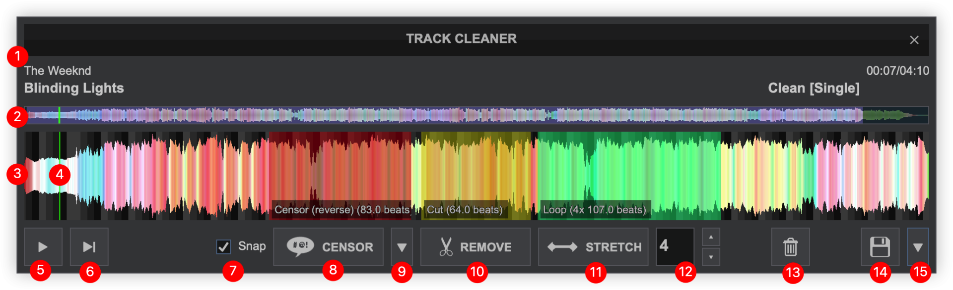 - CENSOR. Plays a section of the track backwards or with muted vocals (censored). Censored areas are marked in Red and will show the censor type as well as the number of beats the censor is applied.