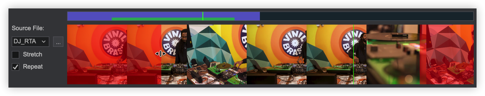 In the Overlay Editor, highlight the section of the clip to be used in the Video Timeline by grabbing the ends of the clip and dragging them to resize and reposition the portion of the clip to be used. Click on Stretch and/or Repeat if the selected area is larger than the video clip being used as the overlay.